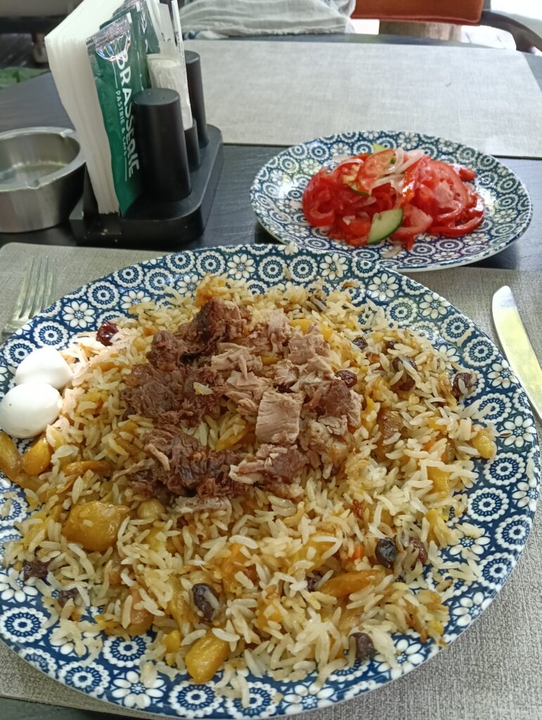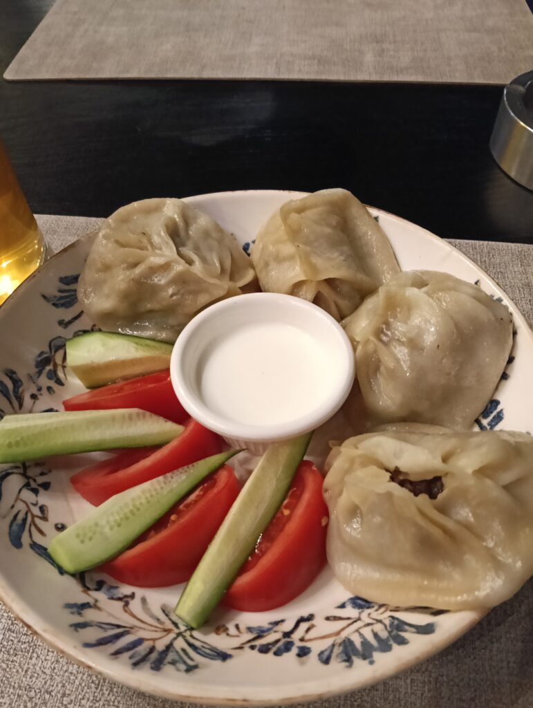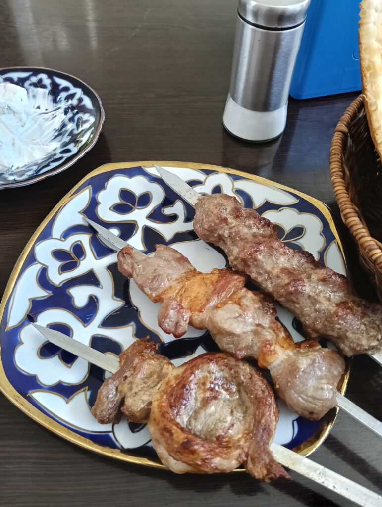 内陸国なのでほとんどの料理に肉類を使っています。脂が多い羊肉も多いですね。そしてスパイスも使われています。名物料理は肉の串刺しのシャシリク、プロフ(ピラフ)、マントゥ(羊肉の蒸し餃子)など。美味しいのですが和食に比べるとかなり胃に負担があるといえるでしょう。