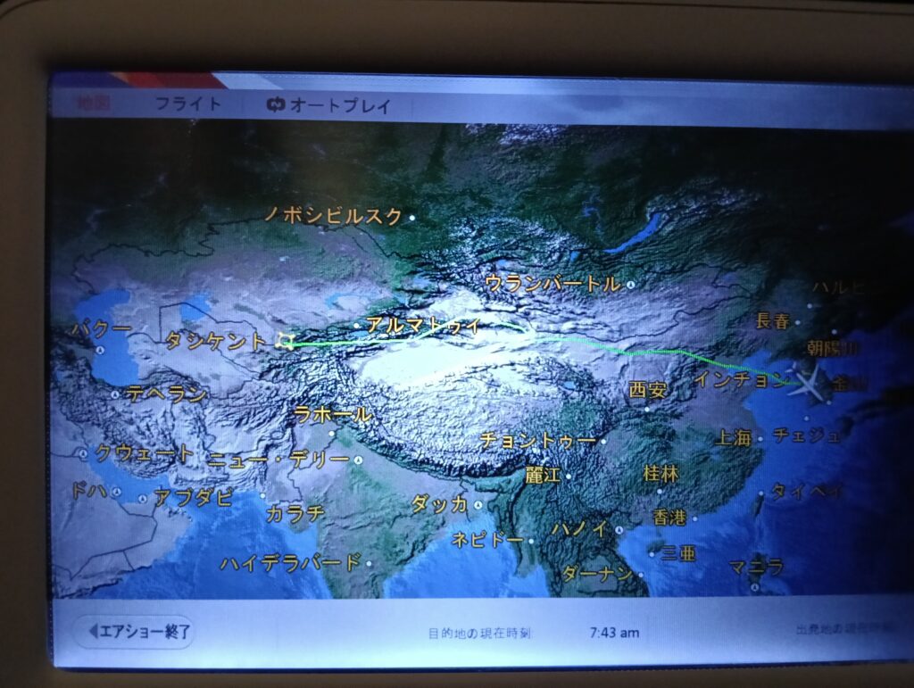 なお東京・ソウル間は約2.5時間、ソウル・ウズベキスタン間は行きが約8時間、帰りは約5.5時間でした。