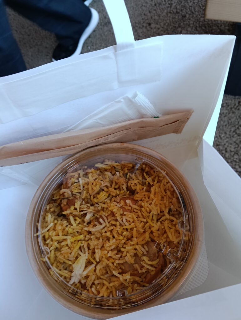 そして、目当てのパビリオンで食事をするということがもはや不可能なので、ちょうど目についたこちらのテイクアウトでビリヤニを買って食べました。注文も提供も機能的であっという間。昼食難民には助かる存在かもしれません。近くに大屋根リングがあり、座って食べることもできます。結構スパイスが効いていて美味しかったです♪