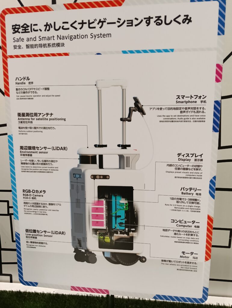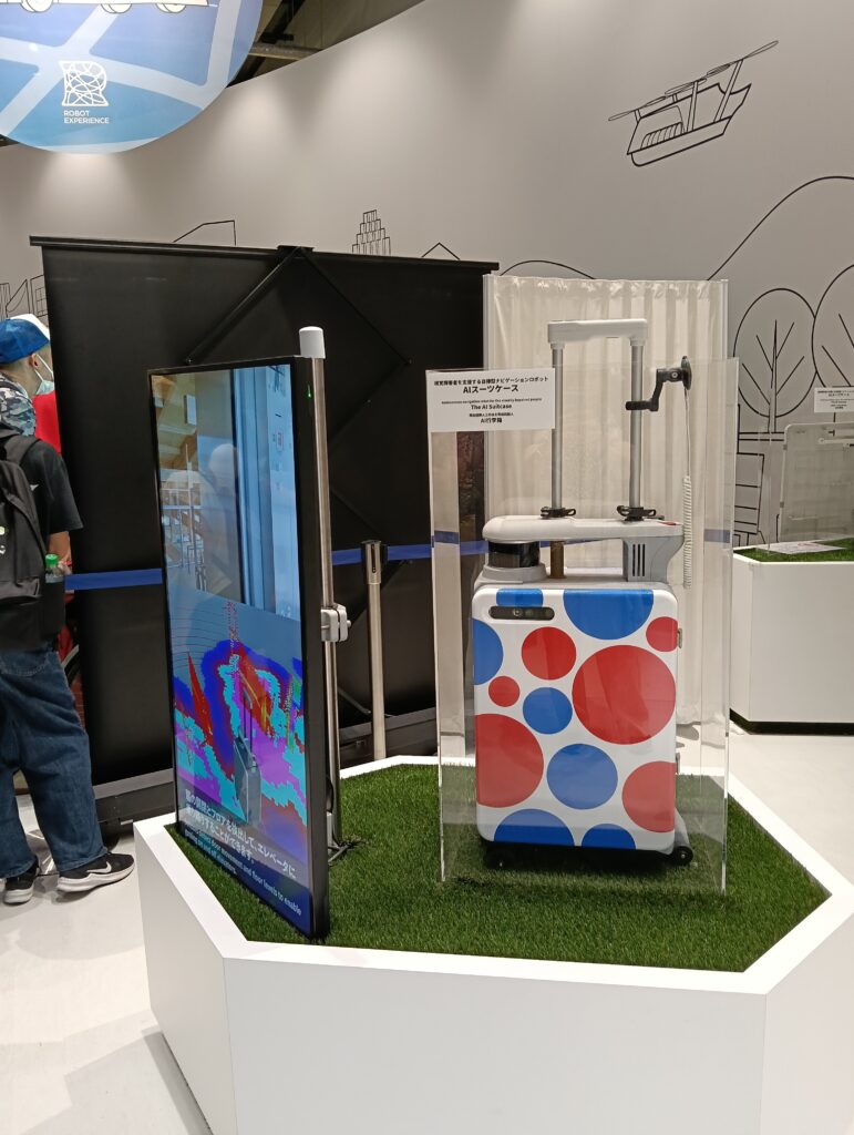 最も興味深かったのは「AIスーツケース」。盲導犬のようにAIを搭載したスーツケース型のナビゲーターが視覚障がい者の補助をするというしくみのロボットです。